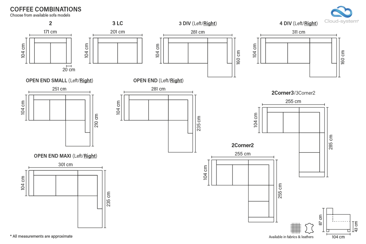 | COFFEE stūra dīvāns C2C | 104x255x255 cm | No 1386 € |