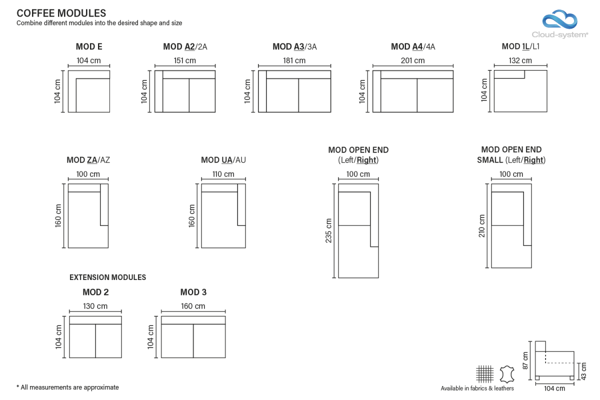 Izvēlies no standarta izmēriem vai arī izvēlies moduļus, lai izveidotu dīvānu tieši tev nepieciešamajā izmērā un moduļu kombinācijā!